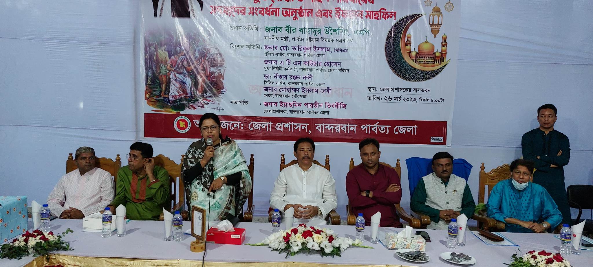 জেলা প্রশাসক ইয়াছমিন পারভীন তিবরীজি এর সভাপতিত্বে আয়োজিত অনুষ্ঠানে প্রধান অতিথি হিসেবে উপস্থিত ছিলেন পার্বত্য চট্রগ্রাম বিষয়ক মন্ত্রনালয় এর মন্ত্রী বীর বাহাদুর উশৈসিং,এমপি।এছাড়াও মহান স্বাধীনতা ও জাতীয় দিবস উপলক্ষ্যে জেলা প্রশাসনের পাশাপাশি নানা কর্মসূচির মধ্য দিয়ে দিবসটি পালন করেছে বান্দরবান পার্বত্য জেলা পরিষদ,বান্দরবান জেলা আওয়ামীলীগ ও এর সহযোগী সংগঠনগুলো।