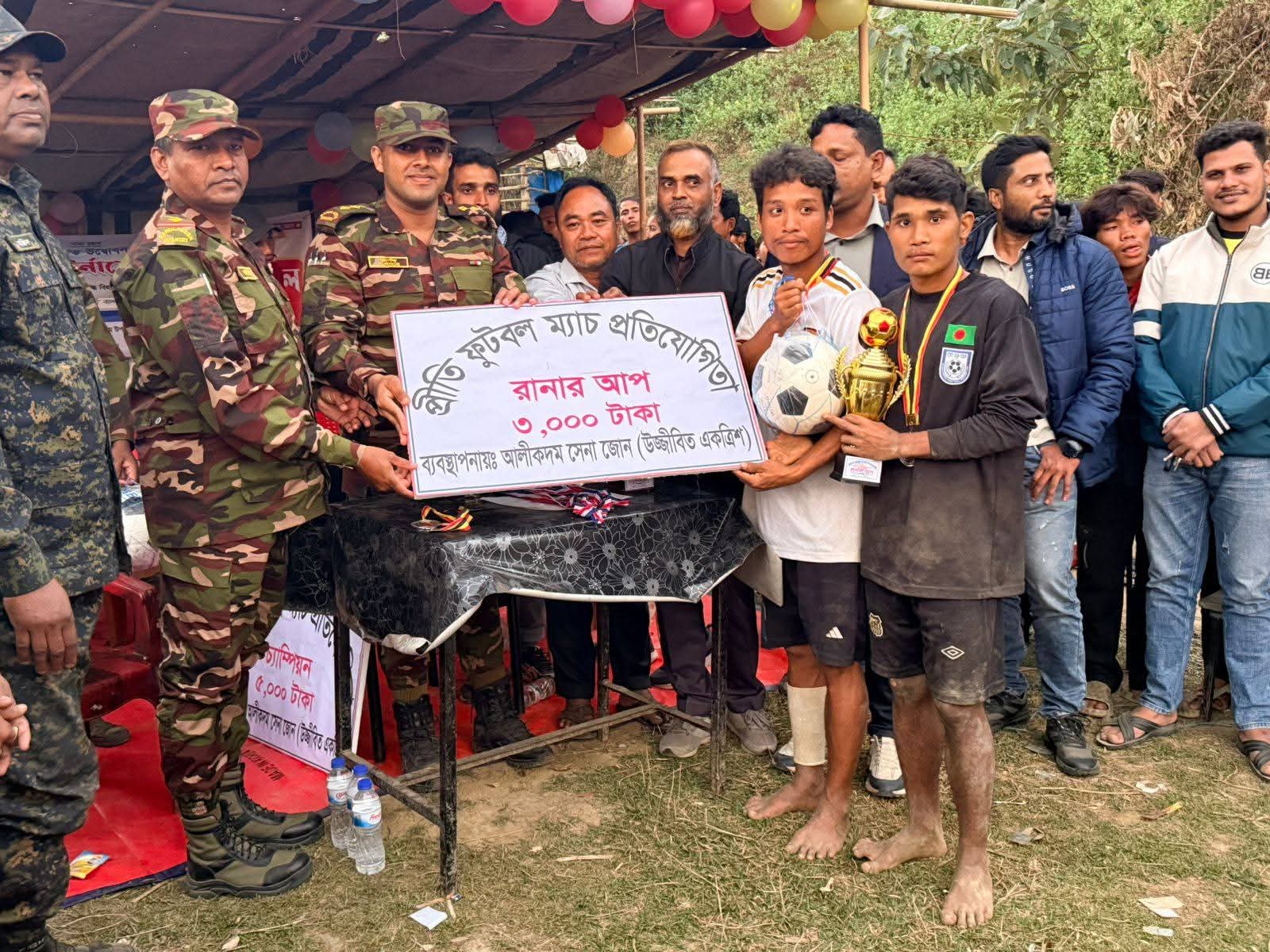 বান্দরবান পার্বত্য জেলার আলীকদম উপজেলার কুরুকপাতা ইউনিয়নে নবনির্মিত বৌদ্ধ বিহার উদ্বোধন উপলক্ষে আয়োজিত ফুটবল টুর্নামেন্ট–২০২৫ উৎসবমুখর,সুশৃঙ্খল ও শান্তিপূর্ণ পরিবেশে সফলভাবে সম্পন্ন হয়েছে।বাংলাদেশ সেনাবাহিনীর আলীকদম সেনা জোনের পৃষ্ঠপোষকতায় আয়োজিত এ ক্রীড়া উৎসব স্থানীয় জনগণের ব্যাপক অংশগ্রহণে সামাজিক সম্প্রীতি,সৌহার্দ্য ও সহাবস্থানের এক উজ্জ্বল দৃষ্টান্ত স্থাপন করেছে।স্থানীয় সূত্রে জানা যায়,গত ২৩ নভেম্বর ২০২৫ তারিখে কুরুকপাতা বাজার এলাকায় টুর্নামেন্টটির আনুষ্ঠানিক উদ্বোধন করা হয়।শুরুতে স্থানীয় আয়োজক কমিটির ব্যবস্থাপনায় প্রতিযোগিতা পরিচালিত হলেও,অংশগ্রহণকারী দল ও দর্শকের সংখ্যা বৃদ্ধি পাওয়ায় শৃঙ্খলা ও নিরাপত্তা নিশ্চিত করতে পরবর্তীতে আলীকদম সেনা জোনের অধীনস্থ মেনদপাড়া আর্মি ক্যাম্পের সার্বিক তত্ত্বাবধানে টুর্নামেন্টটি পরিচালিত হয়।এতে কুরুকপাতা ও পার্শ্ববর্তী এলাকার মোট ১৪টি দল অংশগ্রহণ করে।দীর্ঘ প্রতিযোগিতার পর রোমাঞ্চকর ফাইনাল ম্যাচে কুরুকপাতা যুব একাদশ চ্যাম্পিয়ন হওয়ার গৌরব অর্জন করে।অপরদিকে কালিয়ারছড়া একাদশ রানারআপ হিসেবে নির্বাচিত হয়।