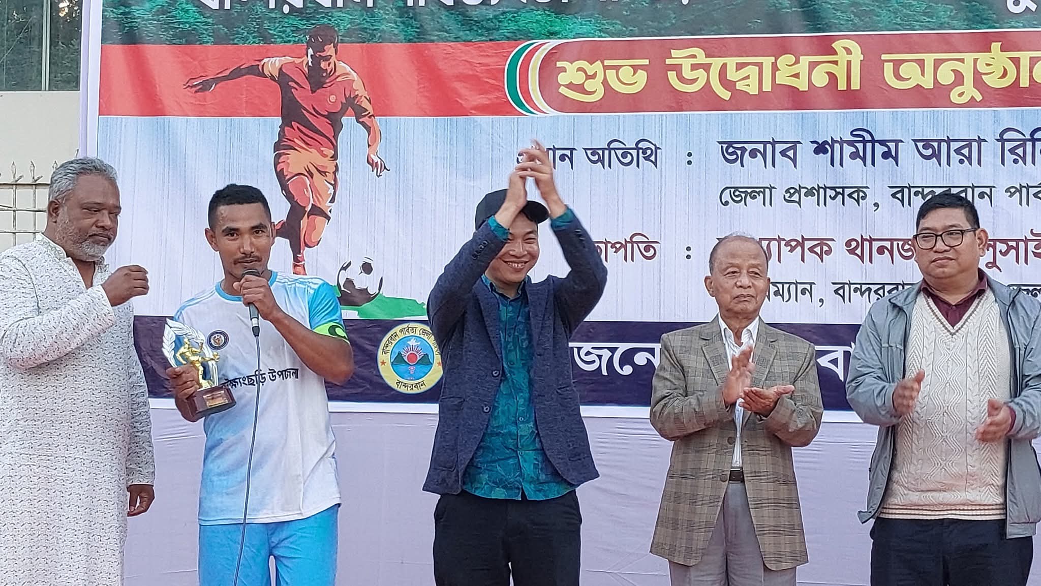 গত (৯ ডিসেম্বর) বর্ণাঢ্য আয়োজনে বান্দরবানে শুরু হওয়া বান্দরবান পার্বত্য জেলা পরিষদ গোল্ডকাপ ফুটবল টুর্ণামেন্ট-২৫ এর তৃতীয় দিনের খেলা অনুষ্ঠিত হয়েছে।শুক্রবার (১২ ডিসেম্বর) বিকেলে লাম উপজেলা কে ২-০ গোলে পরাজিত করে ফাইনাল নিশ্চিত করেছে টুর্নামেন্ট এর শক্তিশালী নাইক্ষ্যংছড়ি উপজেলা দল।বিকেলে অনুষ্ঠিত এই খেলায় প্রধান অতিথি হিসেবে উপস্থিত হয়ে খেলা উপভোগ করেন এবং সেরা খেলোয়াড়ের হাতে ম্যান অফ দ্যা ম্যাচ পুুরষ্কার তুলে দেন জেলা পরিষদ চেয়ারম্যান অধ্যাপক থানজামা লুসাই।জেলা পরিষদ সদস্য ও ক্রীড়া বিষয়ক কনভেনিং কমিটির আহবায়ক অ্যাডভোকেট উবাথোয়াই মারমা,মং এচিং চাক,জেলা ক্রীড়া অফিসার রেজাউল করিম প্রমূখ এসময় উপস্থিত ছিলেন।নাইক্ষ্যংছড়ি ফুটবল দলের অধিনায়ক প্রুলা চিং অসাধারন নৈপুন্য প্রদর্শন করে ম্যান অফ দ্যা ম্যাচ নির্বাচিত হন।নাইক্ষ্যংছড়ি উপজেলা দলের ১৭ নাম্বার জার্সিধারি কাশেম এবং ১১ নাম্বার জার্সিধারী ফয়েজ দলের পক্ষে দুটি গোল করেন।