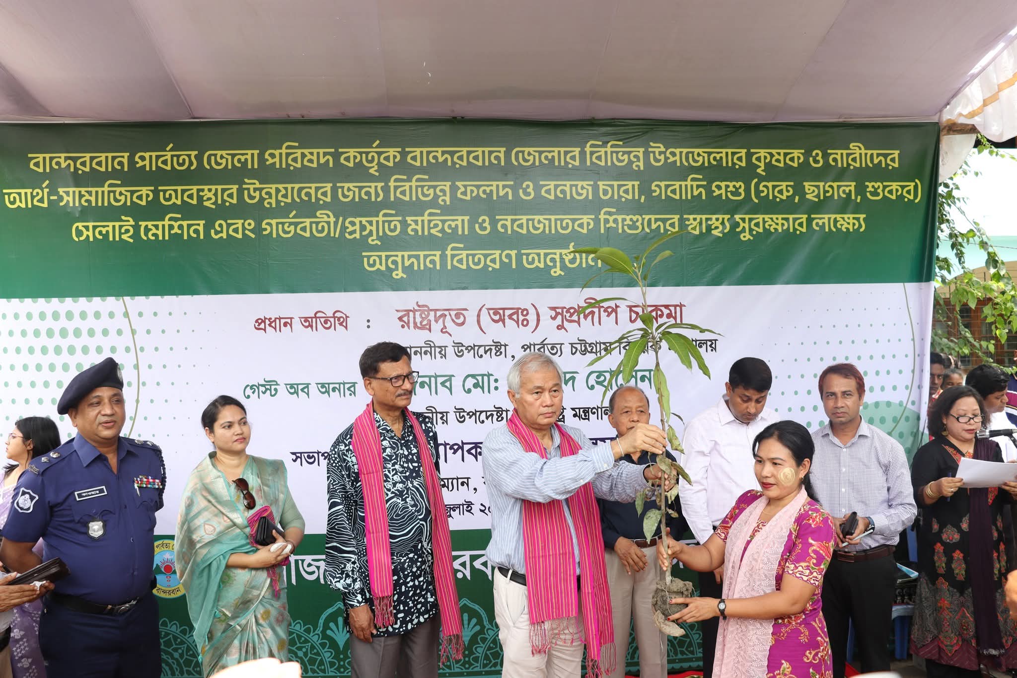 বান্দরবান পার্বত্য জেলা পরিষদের চেয়ারম্যান অধ্যাপক থানজামা লুসাইয়ের সভাপতিত্বে অনুষ্ঠিত অনুষ্ঠানে অন্যান্যদের মধ্যে উপস্থিত ছিলেন পার্বত্য মন্ত্রণালয়ের উপদেষ্টা সাবেক রাষ্ট্রদূত সু প্রদীপ চাকমা,বান্দরবানের জেলা প্রশাসক শামীম আরা রিনি,পুলিশ সুপার মো.শহীদুল্লাহ কাওছার, জেলা পরিষদের মুখ্য নির্বাহী মো.নজরুল ইসলাম প্রমুখ।এছাড়া অনুষ্ঠানে জেলা পরিষদের ন্যাস্ত বিভাগের কর্মকর্তা ও বিভিন্ন এলাকার উপকারভুগী নারী-পুরুষ উপস্থিত ছিলেন।অনুষ্ঠানে পার্বত্য উপদেষ্টা সুপ্রদীপ চাকমা বলেন, পার্বত্য চট্টগ্রামের মানুষের আত্মসামাজিক অবস্থার উন্নয়নের জন্য সরকার নানামুখী পদক্ষেপ নিয়েছে। এ লক্ষ্যে পার্বত্য মন্ত্রণালয় কাজ করে যাচ্ছে।