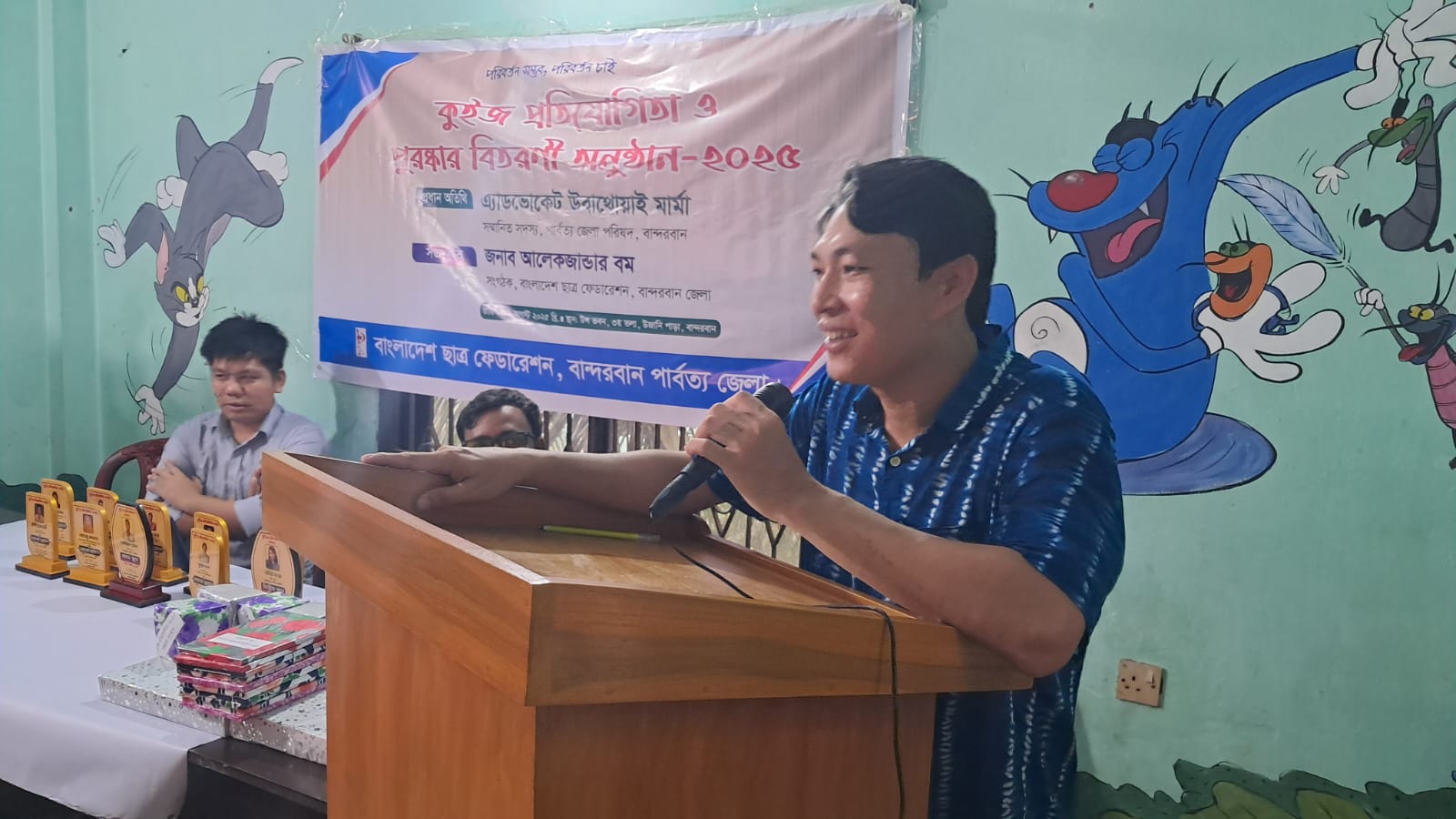 একই দিন বাংলাদেশ ছাত্র ফেডারেশনের উদ্যোগে কুইজ প্রতিযোগিতা ও পুরস্কার বিতরণী অনুষ্ঠিত হয়।পায়েল দের সঞ্চালনায় বাংলাদেশ ছাত্র ফেডারেশন বান্দরবান জেলার সংগঠক আলেকজান্ডার বম এর সভাপতিত্বে কুইজ প্রতিযোগিতা ও পুরস্কার বিতরণী অনুষ্ঠান অনুষ্ঠিত হয়।উক্ত অনুষ্ঠানে প্রধান অতিথির বক্তব্যে পার্বত্য জেলা পরিষদ সদস্য এডভোকেট উবা থোয়াই মার্মা বলেন,বান্দরবান ছাত্রছাত্রীদের জ্ঞান বৃদ্ধিতে এমন আয়োজন অবদান রাখবে।ভবিষ্যতে ছাত্র ছাত্রীরা জ্ঞান বৃদ্ধি করে নিজের দেশের উন্নয়ন কাজ করতে পারবে।