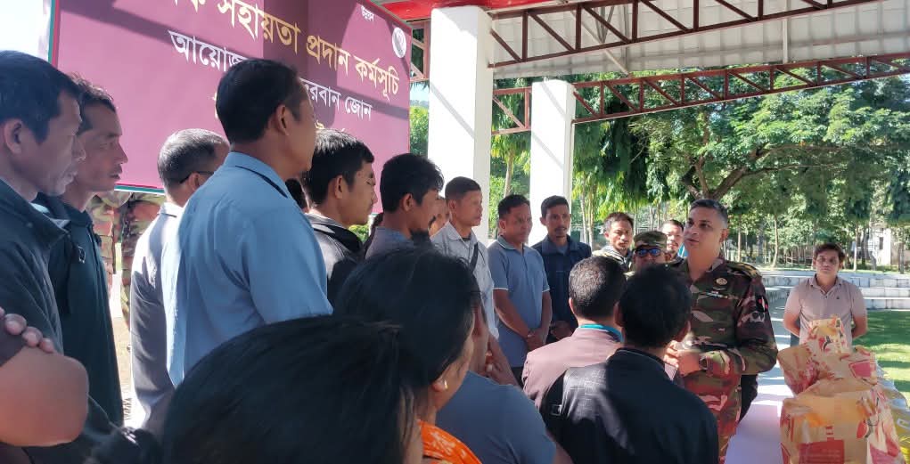 এসময় জোন কমান্ডার প্রত্যাগত সদস্যদের সাথে শুভেচ্ছা বিনিময় করেন এবং খোঁজখবর নেন।আইনি সহায়তাসহ যেকোনও প্রয়োজনে তাদের পাশে থাকার প্রত্যয় জানান।মানবিক সহায়তা প্রদানকালে সদর জোনের জোনাল স্টাফ অফিসার মেজর এএসএম মাইদুল ইসলাম,বম পরিবারের সদস্য এবং বিভিন্ন প্রিন্ট ও ইলেকট্রনিক মিডিয়ার সাংবাদিকরা উপস্থিত ছিলেন।বান্দরবান জোন জানিয়েছে,২৬ সদস্যের প্রত্যেক কে ৫০ কেজি চাল,৫ কেজি ডাল,৫ কেজি লবন,৫ কেজি তেল,৫ কেজি আলু,৫ কেজি করে পেয়াজ প্রদান করা হয়।প্রসঙ্গত.গত কয়েক বছর ধরে পার্বত্য এলাকার আঞ্চলিক সংগঠন কুকি চিন ন্যাশনাল ফ্রন্টের (কেএনএফ) অত্যাচারে বান্দরবানের বিভিন্ন পাড়া থেকে অসংখ্য বম পরিবার পালিয়ে বিভিন্নস্থানে চলে যায়।পরে সেনাবাহিনীর সহযোগীতা ও নিরাপত্তার মধ্যে পালিয়ে যাওয়া বম পরিবারগুলো ধীরে ধীরে নিজ নিজ বাসস্থানে ফিরতে শুরু করেছে এবং তাদের পাশে রয়েছে বাংলাদেশ সেনাবিহীনি।