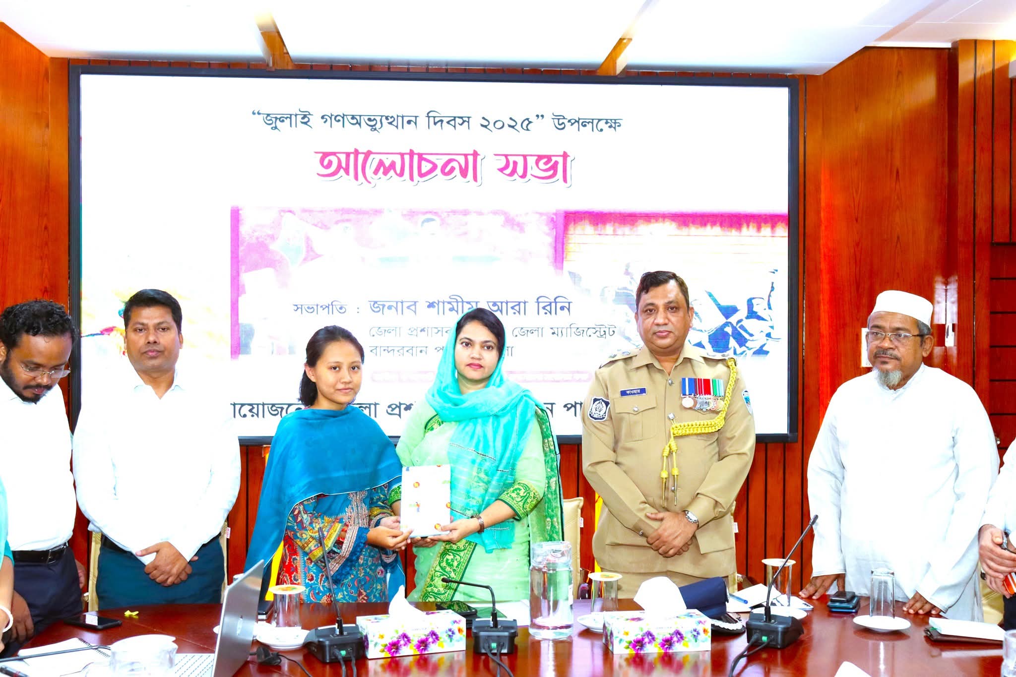 নানা কর্মসুচীর মধ্য দিয়ে বান্দরবানে উদযাপিত হয়েছে জুলাই গণঅভ্যুত্থান দিবস ২০২৫।দিবসটি উপলক্ষ্যে বান্দরবান জেলা প্রশাসনের আয়োজনে জেলা প্রশাসকের কার্যালয়ে ৫আগষ্ট (মঙ্গলবার) সকালে আয়োজন করা হয় এক আলোচনা সভা।সভায় প্রধান অতিথি হিসেবে উপস্থিত ছিলেন জেলা প্রশাসক শামীম আরা রিনি।এসময় পুলিশ সুপার মো.শহীদুল্লাহ কাওছার,অতিরিক্ত জেলা প্রশাসক এস এম মনজরুল হক,অতিরিক্ত জেলা প্রশাসক মমতা আফরিন, অতিরিক্ত জেলা ম্যাজিস্ট্রেট (এডিএম) এস এম হাসান, সহকারী কমিশনার ও এক্সিকিউটিভ ম্যাজিস্ট্রেট আসিফ রায়হান,সহকারী কমিশনার ও এক্সিকিউটিভ ম্যাজিস্ট্রেট জয়া দত্ত,কৃষি সম্প্রসারণ অধিদপ্তরের উপ পরিচালক এম এম শাহ নেয়াজ,সমাজ সেবা বিভাগের উপ পরিচালক মিলটন মুহুরী, বাংলাদেশ জামায়েত ইসলামী বান্দরবান জেলার আমীর এস এম আবদুচ ছালাম আযাদ,বৈষম্য বিরোধী ছাত্র আন্দোলনের প্রতিনিধি আসিফ ইকবালসহ বিভিন্ন সরকারি প্রতিষ্ঠানের উর্ধতন কর্মকর্তা,সাংবাদিক এবং সুশীল সমাজের প্রতিনিধিরা এসময় উপস্থিত ছিলেন।