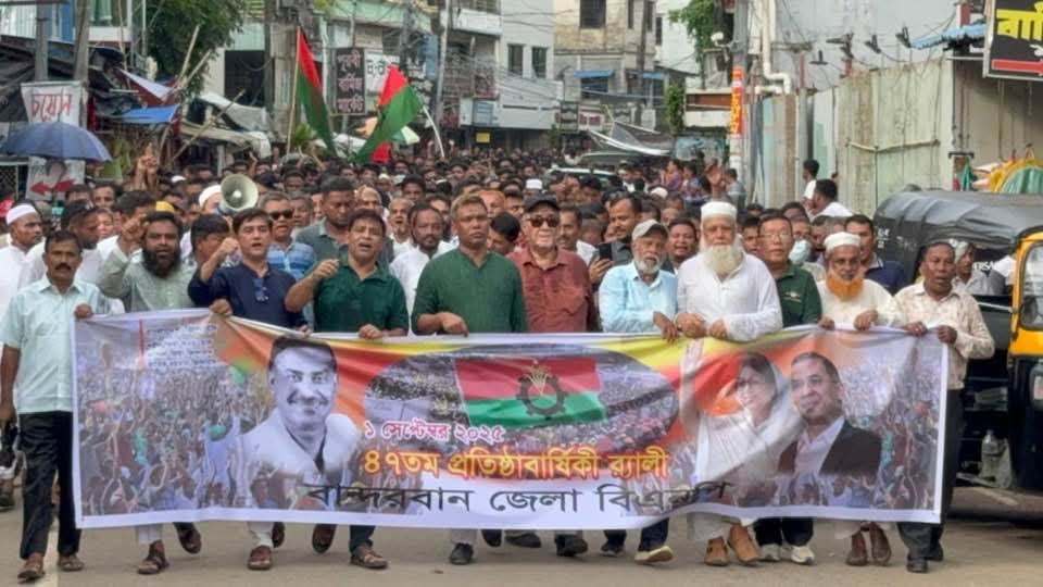 পার্বত্য জেলা বান্দরবানে নানা আয়োজনে জাতীয়তাবাদী দল বিএনপির প্রতিষ্ঠাবার্ষিকী পালিত হয়েছে।এ উপলক্ষে সোমবার (১ সেপ্টেম্বর) বিকেলে শহরের রাজবাড়ী মাঠ থেকে একটি বর্ণাঢ্য শোভাযাত্রা বের হয়।এটি শহরের গুরুত্বপূর্ণ সড়ক প্রদক্ষিণ করে।পরে শহীদ আবু সাঈদ মুক্তমঞ্চে আলোচনা সভা অনুষ্ঠিত হয়।এতে বক্তব্য রাখেন জেলা বিএনপির আহ্বায়ক সাচিংপ্রু জেরী,সাবেক সংসদ সদস্য ম্যামাচিং,জেলা বিএনপির সদস্য সচিব জাবেদ রেজা,জেলা বিএনপির যুগ্ম আহ্বায়ক অধ্যাপক ওসমান গনি,মুজিবুর রশিদ, বিএনপি নেতা জসিম উদ্দিন তুষার,জাহাঙ্গীর আলম,জেলা মহিলা দল সভাপতি কাজী নিরুতাজ বেগম,জেলা যুবদল সভাপতি জহির উদ্দিন মাসুম প্রমুখ।এছাড়াও সভায় জেলা বিএনপি অঙ্গ ও সহযোগী সংগঠনের বিভিন্ন পর্যায়ের নেতাকর্মীরা বক্তব্য রাখেন।