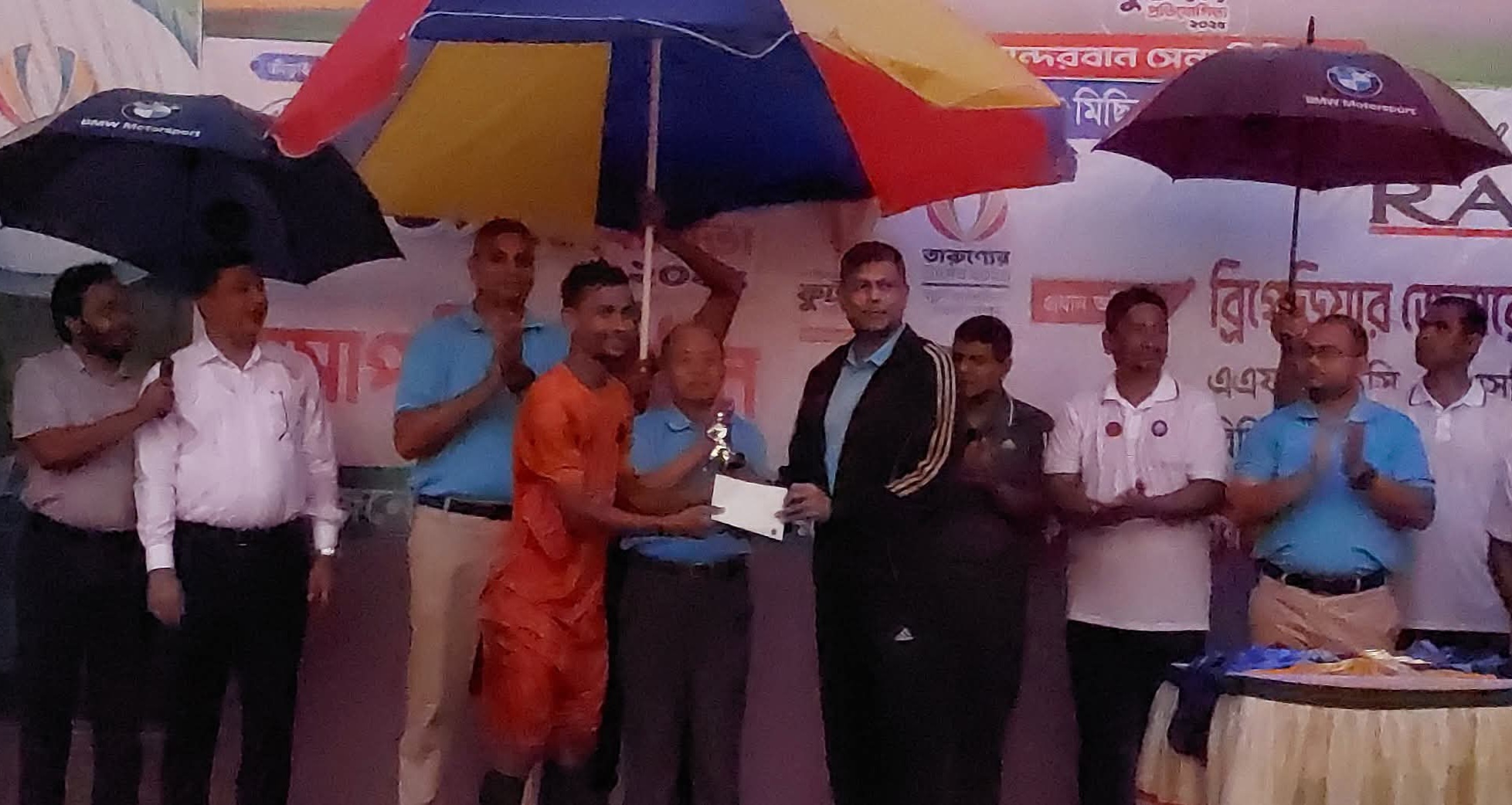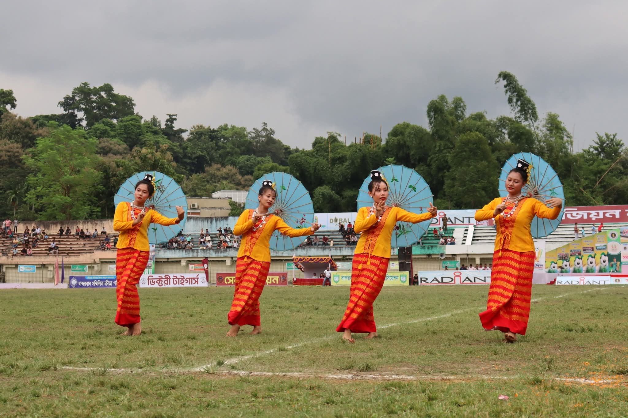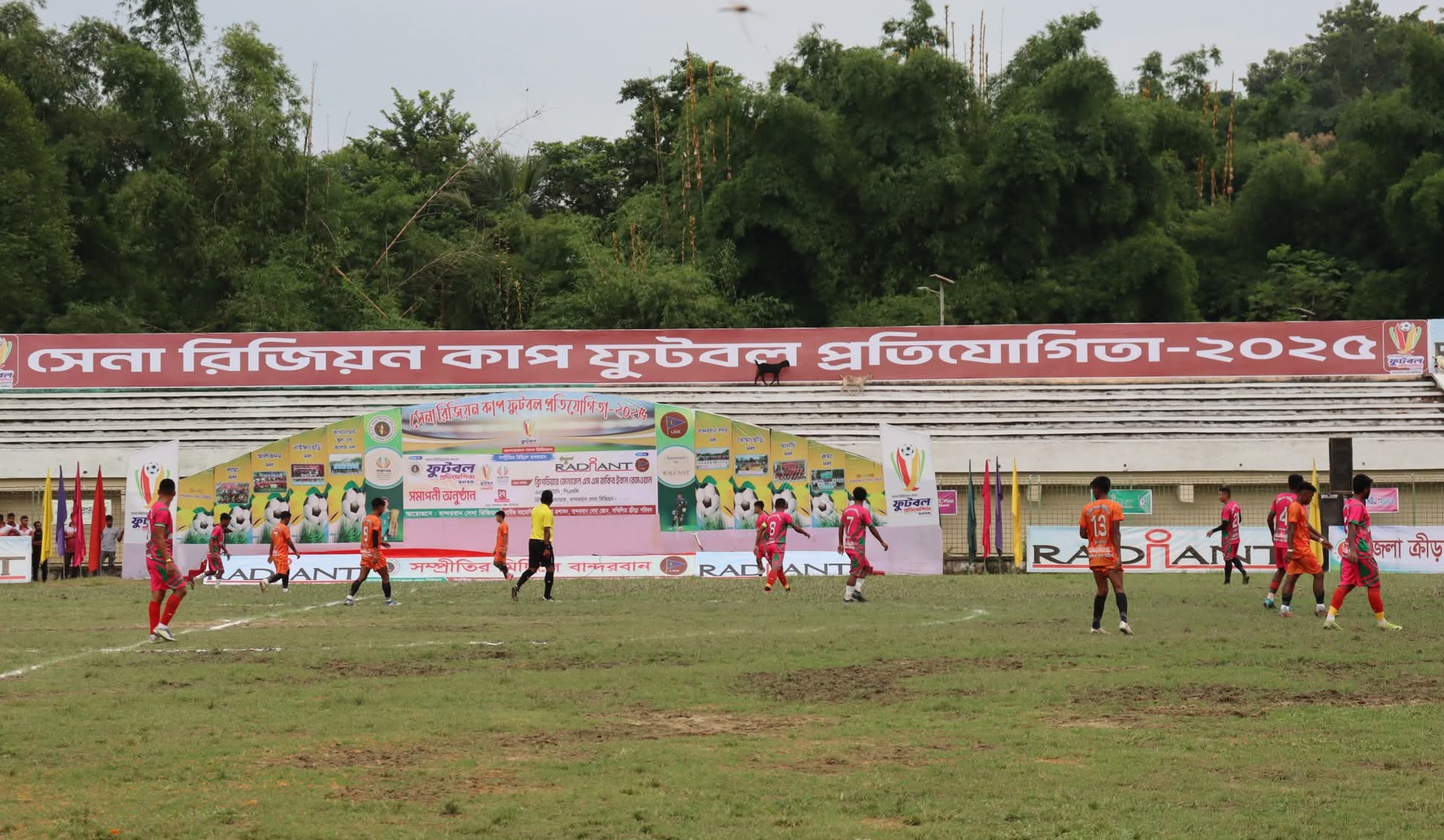 বর্ণাঢ্য আয়োজনে বান্দরবানে সমাপ্ত হলো সেনা রিজিয়ন কাপ ফুটবল প্রতিযোগিতা-২০২৫।শনিবার (২৭ সেপ্টেম্বর) বিকেলে বান্দরবান জেলা স্টেডিয়ামে বান্দরবান সেনা রিজিয়ন এর আয়োজনে এবং জেলা প্রশাসন ও বান্দরবান সেনা জোন এর সার্বিক সহযোগিতায় আয়োজিত সমাপনী অনুষ্ঠানে প্রধান অতিথি হিসেবে উপস্থিত হয়ে ফাইনাল খেলা উপভোগ করেন ও পুরষ্কার বিতরন করেন বান্দরবান সেনা রিজিয়ন এর কমান্ডার ব্রিগেডিয়ার জেনারেল এস এম রাকিব ইবনে রেজওয়ান,এএফডব্লিউসি,পিএসসি।ফাইনাল খেলায় আলীকদম উপজেলা দল ২-১ গোলে নাইক্ষ্যংছড়ি উপজেলা দলকে পরাজিত করে সেনা রিজিয়ন ফুটবল প্রতিযোগিতা-২৫ এর চ্যাম্পিয়ন শিরোপা অর্জন করে।এসময় বিশেষ অতিথি হিসেবে উপস্থিত ছিলেন বান্দরবান পার্বত্য জেলা পরিষদ এর চেয়ারম্যান অধ্যাপক থানজামা লুসাই।এসময় প্রধান অতিথি রিজিয়ন কমান্ডার ব্রিগেডিয়ার জেনারেল এস এম রাকিব ইবনে রেজওয়ান বলেন, “সেনাবাহিনী সবসময় তরুণ প্রজন্মকে সুস্থ ধারার খেলাধুলায় সম্পৃক্ত রাখতে এবং পার্বত্য চট্টগ্রামের সামাজিক সম্প্রীতি ও ভ্রাতৃত্ববোধকে জোরদার করতে প্রতিশ্রুতিবদ্ধ।খেলাধুলা শুধু বিনোদন নয়,এটি শৃঙ্খলা ও অধ্যবসায় এবং দলগত চেতনার শিক্ষা দেয়।এই ধরনের টুর্নামেন্ট আয়োজনের অন্যতম উদ্দেশ্য হলো প্রান্তিক পর্যায় থেকে প্রতিভাবান খেলোয়াড় খুঁজে বের করা।যাঁরা ভবিষ্যতে দেশের জন্য আন্তর্জাতিক মানের খেলোয়াড় হিসেবে গড়ে উঠতে পারবেন।সেনাবাহিনী শুধু অভিযান,শৃঙ্খলা ও জাতীয় দায়িত্ব পালনে নয়,বরং ক্রীড়া ও সংস্কৃতির বিকাশেও নিরলসভাবে কাজ করছে।এ ধরনের উদ্যোগ ভবিষ্যৎ নেতৃত্ব গড়ে তুলবে এবং তরুণদের সঠিক পথে পরিচালিত করবে।এসময় বিশেষ অতিথি হিসেবে আরও উপস্থিত ছিলেন বান্দরবান জোন এর কমান্ডার লেফটেন্যান্ট কর্নেল এ এস এম মাহমুদুল হাসান,পিএসসি,নবাগত জোন কমান্ডার লেফটেন্যান্ট কর্ণেল মোহাম্মদ হুমায়ন রশিদ,পিএসসি,পুলিশ সুপার মো.শহিদুল্লাহ কাওছার,পিপিএম, অতিরিক্ত জেলা ম্যাজিস্ট্রেট এস এম হাসান,সদর উপজেলা নির্বাহী অফিসার মারুফা সুলতানা খান হীরামনি,টুর্নামেন্ট পরিচালনা কমিটির চেয়ারম্যান ও রোয়াংছড়ি সাব জোন এর কমান্ডার মেজর এম এম ইয়াসিন আজিজ প্রমূখ।প্রবল বৃষ্টি উপেক্ষা করেও গ্যালারিতে দর্শক উপস্থিতি ছিলো চোখে পড়ার মতো।সমাপনী ঘিরে খেলার প্রথমার্ধ শেষে স্থানীয় শিল্পীদের ঐতিহ্যবাহী নৃত্য পরিবেশন করা হয়।আলীকদম উপজেলার পক্ষে জিহাদ ও উজুয়াং মার্মা ১টি করে গোল করেন।অনবদ্য নৈপুন্য প্রদর্শন করে আলীকদম উপজেলা দলের আরিফুল ইসলাম ম্যান অব দ্য টুর্নামেন্ট এবং উজুয়াং ম্যান অব দ্যা ফাইনাল নির্বাচিত হন।টুর্নামেন্ট এর সেরা গোলদাতা ছিলেন আলীকদম উপজেলা দলের উজ