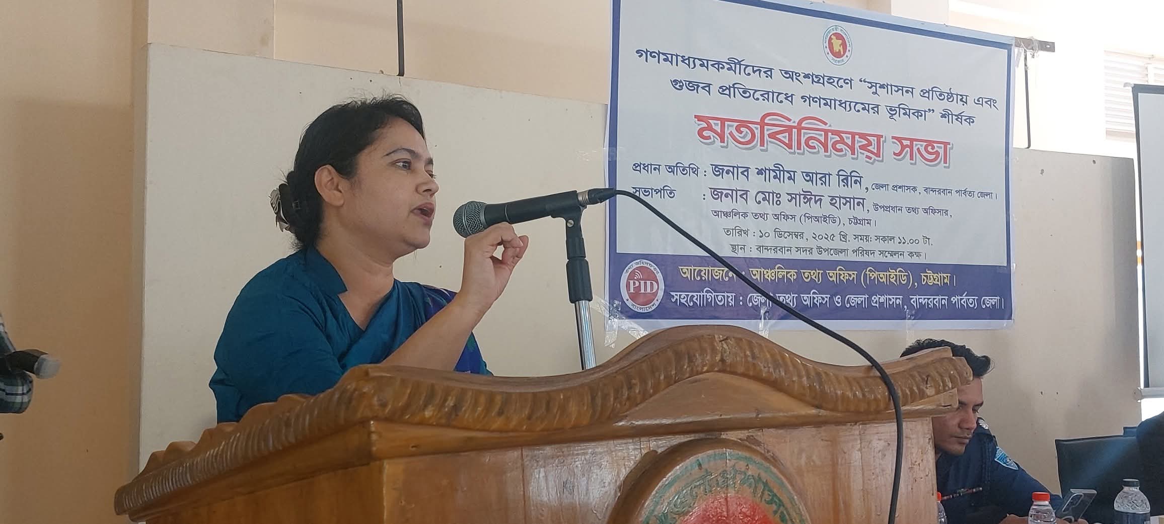 গণমাধ্যমকর্মীদের অংশগ্রহনে "সুশাসন প্রতিষ্ঠায় এবং গুজব প্রতিরোধে গণমাধ্যমের ভূমিকা শীর্ষক মতবিনিময় সভা অনুষ্ঠিত হয়েছে।বুধবার (১০ ডিসেম্বর) সদর উপজেলা পরিষদ সম্মেলন কক্ষে আয়োজিত সভায় প্রধান অতিথি হিসেবে উপস্থিত ছিলেন জেলা প্রশাসক শামীম আরা রিনি। অনুষ্ঠানে সভাপতিত্ব করেন আঞ্চলিক তথ্য অফিস (পিআইডি) চট্রগ্রাম এর উপপ্রধান তথ্য অফিসার মো.সাঈদ হাসান।